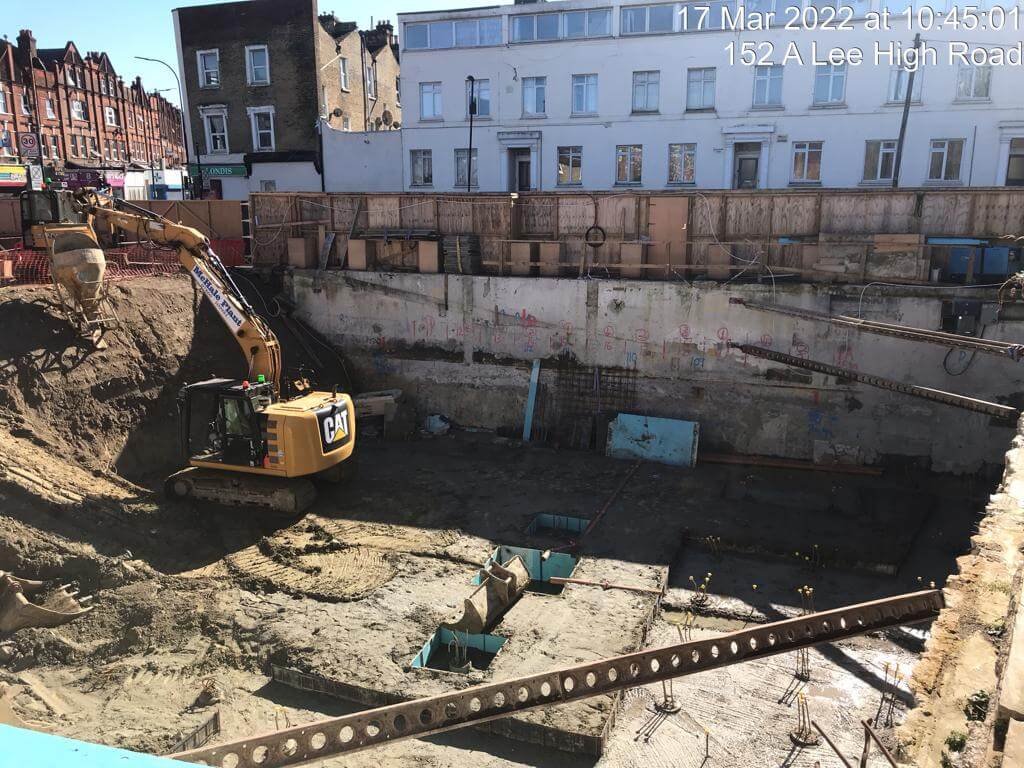 Works are progressing well at our Lee High Rd project in Lewisham to provide seventeen new apartments and two commercial units. Demolition is complete, pile foundations have been installed and the first phase of bulk excavations has started. Now it is time to install pile caps, drainage and lift pits before fixing reinforcement steel and pouring concrete for the basement of the reinforced concrete frame. This will make up the basement, ground and first floors of the development and it will contain the two commercial units, disabled parking spaces and entrance to apartments. All carried out surrounded by red routes, restricted roads, party walls and a river.